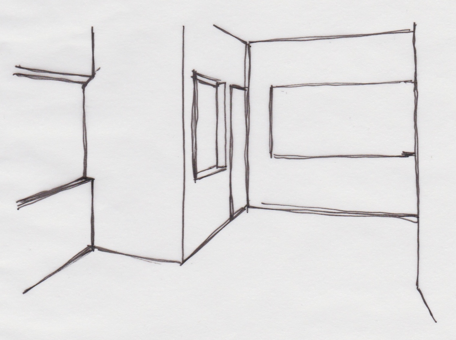One of the important aspects of E 1027 is its furniture and how it creates a space. In many cases Eileen Gray designed the furniture so that it can be moved around a room. Other times she integrates the furniture into walls or makes them walls. If, however, the furniture is removed, then there is not much left of the room. The rooms seem empty and have no special shape or form. Without the furniture there isn't anything special about the rooms. To demonstrate the difference between a room in E 1027 with and without furniture, I made a couple of sketches of rooms void of anything but walls. These sketches are then compared to the same room with furniture.
